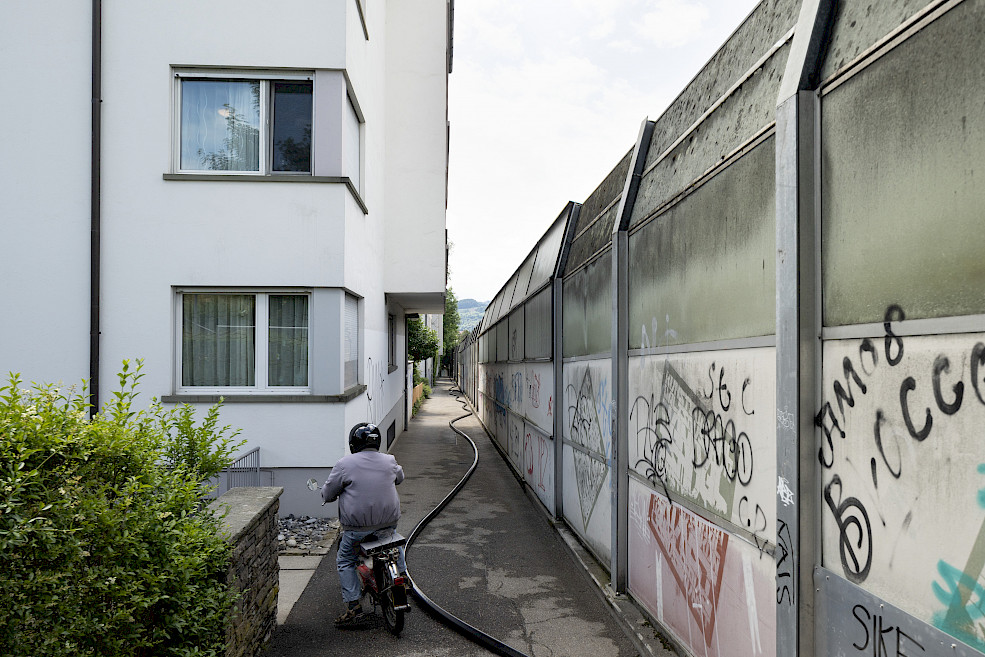 Wohnen an der A6 heute: eingeschlossen von der Lärmschutzwand (Foto: Keystone/Gaetan Bally)